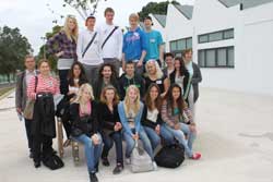8:20 school has no classes, civil servants strike. Guest students and host students allowed to get inside. Not many teachers and members of the staff are there. Guided tour – teacher Militão leads the way followed by the several delegations. Each country has a “private guide” – Teacher Elisabete speaking german with the Germans, teacher Teresa goes with the Latvians and Teacher Vera with the Finns. Visit to the new school area, classrooms, arts area where it is given a short explanation about the Quiz “it’s real, it’s not fake” , mechanics and electronics workshops, outside  group photos , some labs. At the end some coffee and cookies for the teachers. Some teachers that are in school join us, Teacher Urbina comes a little late, gets near the Finns and says:”I just had the first lesson.” Puts her right hand over her breast and continues:”My name is Urbina. How are you?” Great laugh.